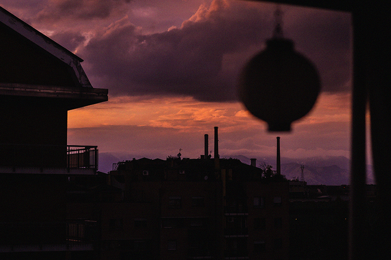 Nel buio, violaceo, che sormonta le case, che specchia le vite e che ci divide, tempesta