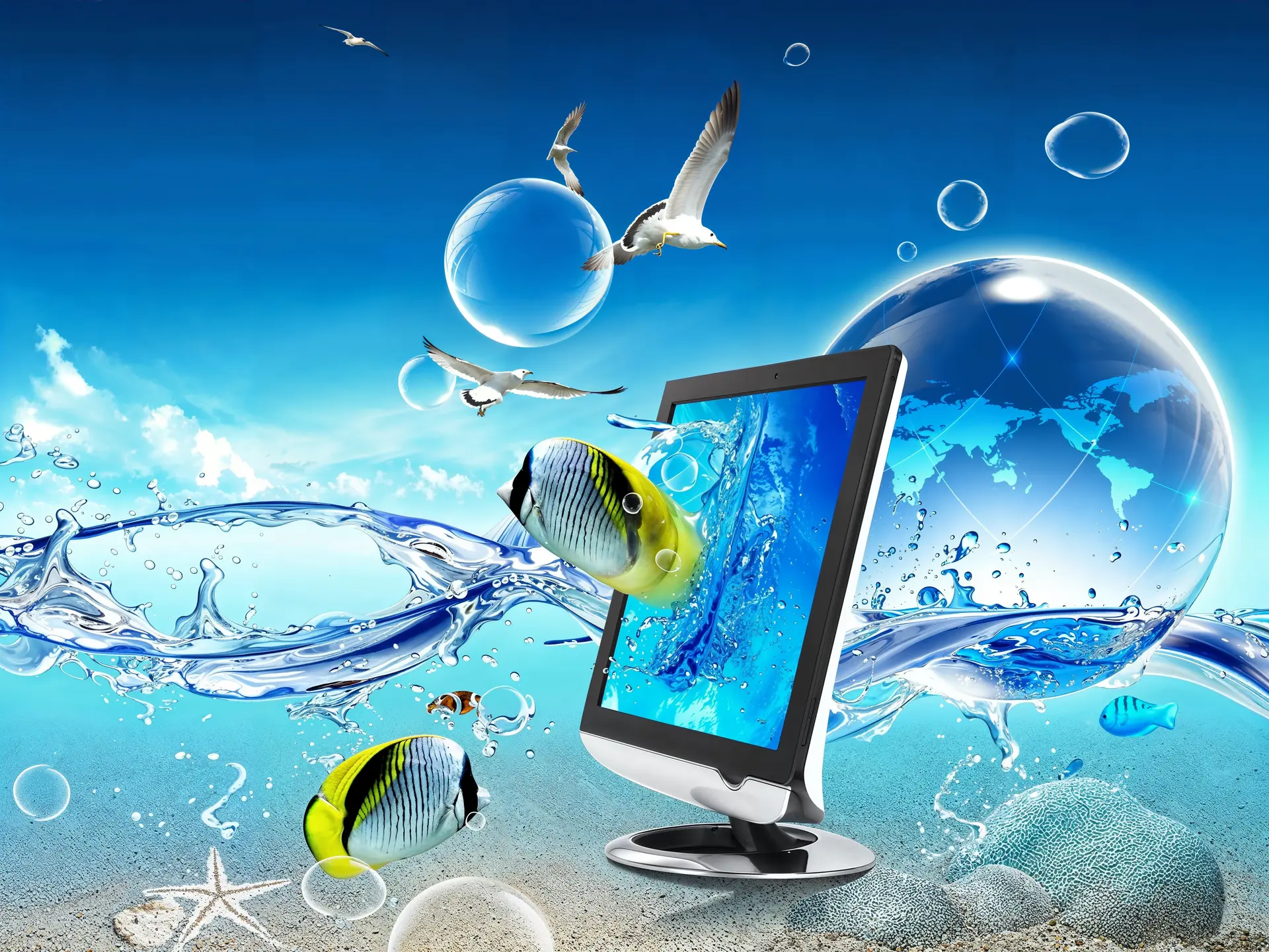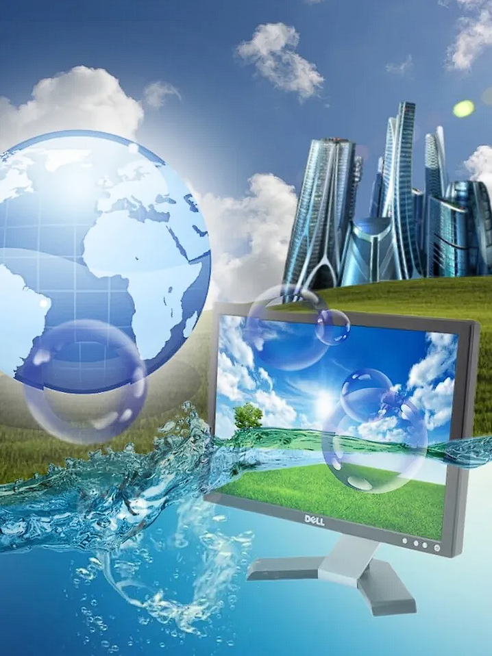 Colori vivaci e brillanti, con una predominanza di tonalità di blu, verde e turchese, richiamano acqua, erba e cielo. Presenza di piante, ucelli e pesci che sembrano fluttuare tra una finestra aperta di Windows e un grattacielo. Queste suggestioni così naturali e “vive” si fondono in completa armonia con elementi tecnologici o grafici.