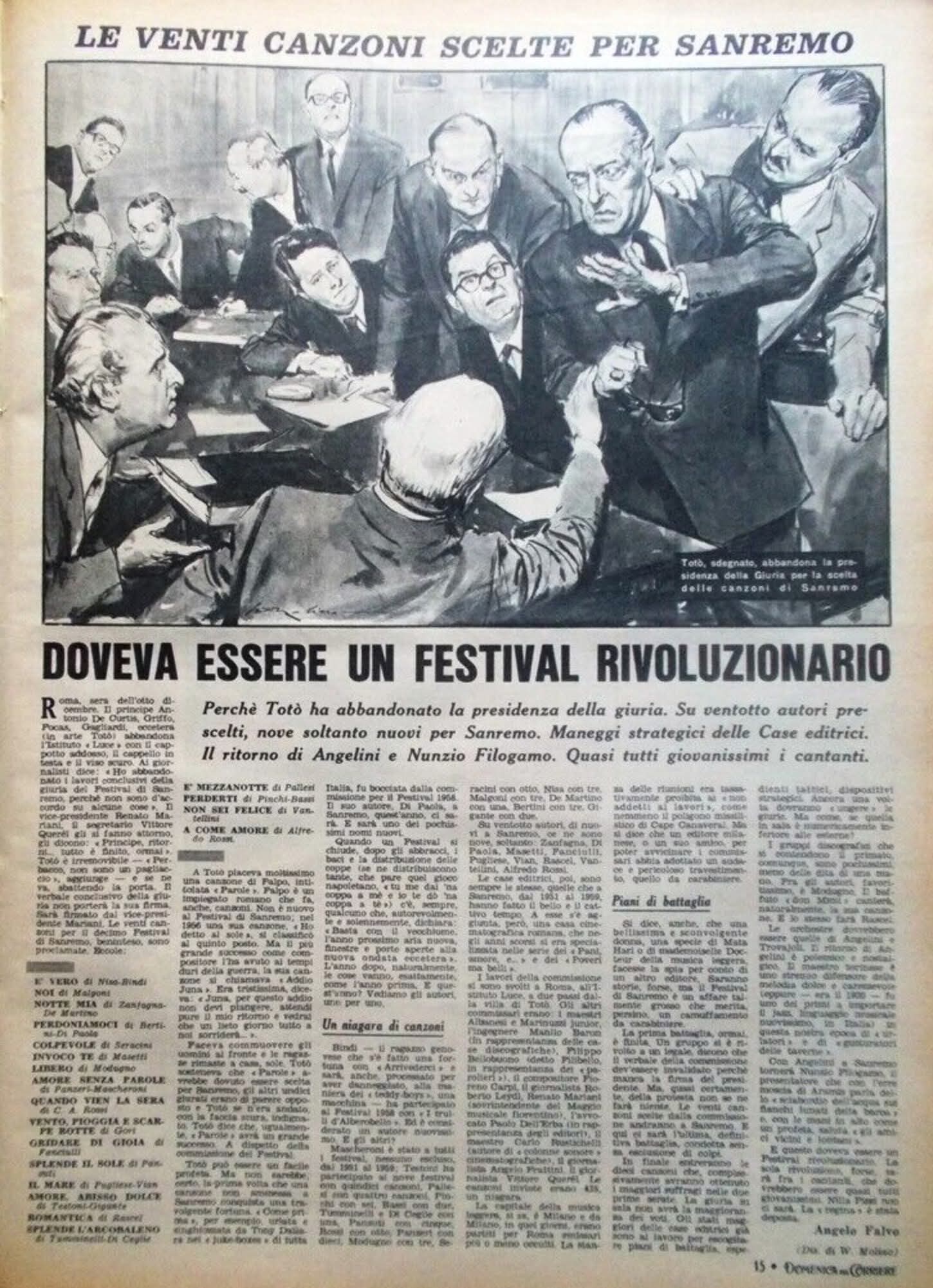 Falvo scrive di un aneddoto che si verificò a fine del 1959 quando la giuria incaricata di selezionare le venti canzoni finaliste per la 10ª edizione del Festival di Sanremo (1960) si riunì a Roma presso l’Istituto Luce, occasione nella quale Antonio De Curtis, in arte Totò, presidente della commissione, lasciò la giuria.