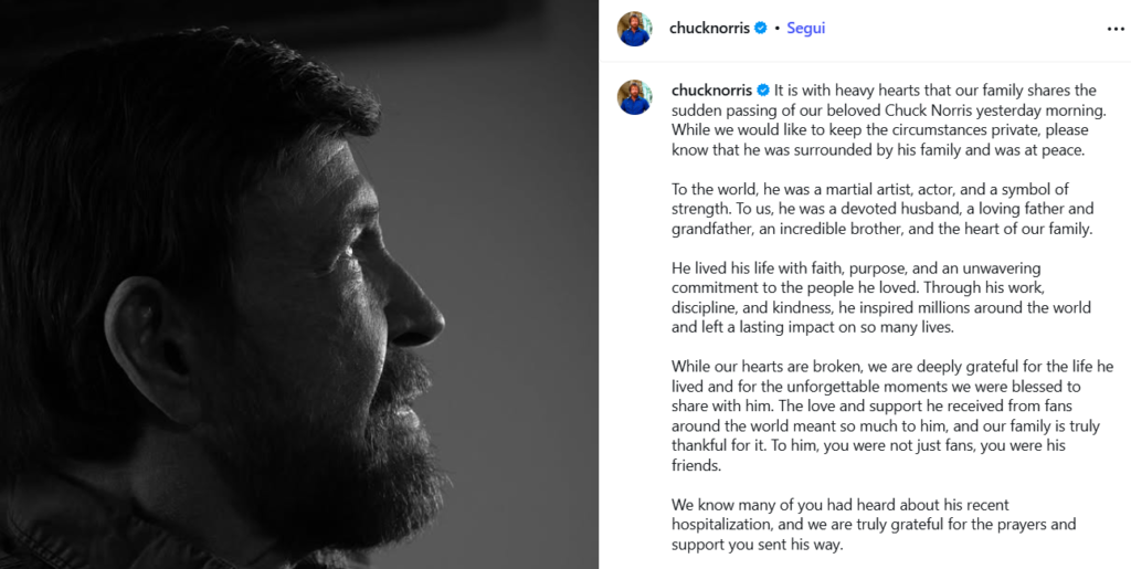 La notizia ha certamente sconvolto sia i fan dell’attore che chi, in realtà, non lo seguiva davvero. Perché Norris non era solo un attore: era qualcosa di più, una di quelle figure simboliche che il mondo dello spettacolo non dimentica facilmente.